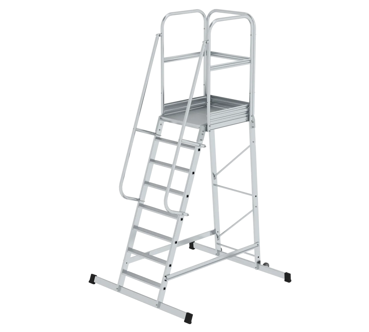 Durchdachte Details wie rutschfeste, geriffelte Stufen, stabile Rechteckrohr-Holme und eine einfache Montage machen diese Plattformleiter zur idealen Wahl für Werkstätten, Lager und Industrieumgebungen.