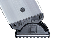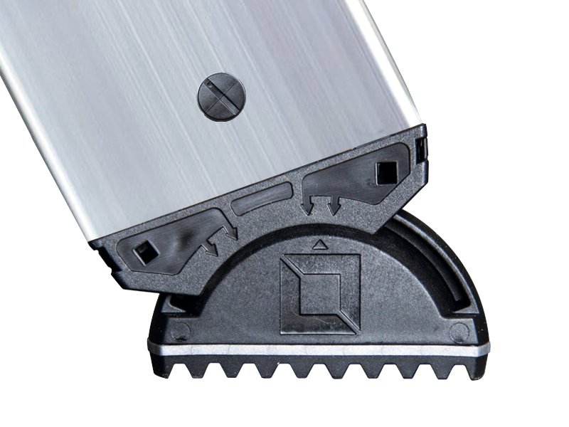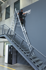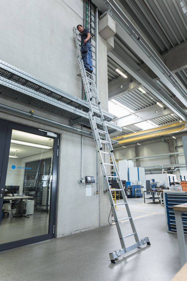 Dank robuster Rechteckrohr-Holme mit 4-fach gebördelter Sprossenverbindung und geriffelten Vierkantsprossen (30 × 30 mm) bietet sie hohe Trittsicherheit. Eine automatische Höhenverstellung mit Abhebesicherung, eine Spreizsicherung mit Polyesterbändern und Metallstrebe sowie Wandlaufrollen für einfaches Handling runden die Ausstattung ab.